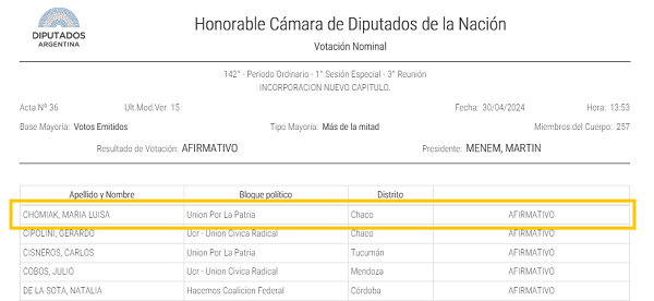 Sin embargo, esta no es la única arista del escándalo. En las actas parlamentarias no están incluidos los votos negativos de Germana Figueroa Casas y Daiana Fernández Molero, del PRO, y de Benedit Beltrán, de LLA. En el video de la transmisión se escucha al presidente de la Cámara nombrarlas y decir que votan negativamente. Igualmente, las actas marcan que estuvieron ausentes al momento de votar.