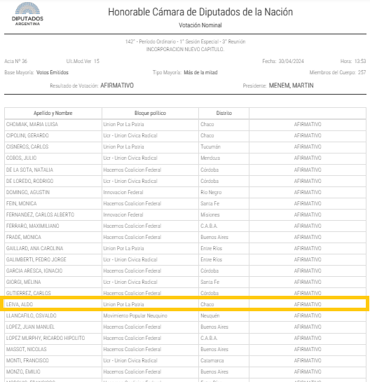 Tal dijo el legislador chaqueño, «el presidente (Menem) accedió (al pedido) porque es una cuestión que es habitual» y «de hecho hay diputados que por ahí votan equivocadamente y después aclaran el sentido de su voto». «Ante esa instancia decidimos manifestar que nos absteníamos; de hecho el presidente dice claramente ‘abstención’, eso se ve en los videos», apuntó Leiva.