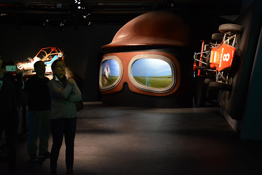 Después de las escaleras mecánicas, en el segundo piso irrumpe la primera sorpresa. El Dodge «La Llamarada» de Marcos Ciani, mítico piloto del Turismo Carretera, proyectado sobre una estructura de fibra de vidrio y con un mapeo de fondo que revive La vuelta de Santa Fe. El viaje comienza en un galpón, con el auto tapado por una tela blanca, y de repente los sentidos se agitan con las imágenes del mapeo y un relato con una voz en off. La yapa: el original está en el subsuelo.