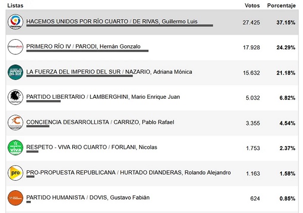 De Rivas –que gobernará Río Cuarto por los próximos cuatro años, en representación del peronismo cordobés– logró sacarle una diferencia de trece puntos a Hernán Parodi, el candidato de la Unión Cívica Radical apoyado por el diputado nacional Rodrigo De Loredo; mientras que Adriana Nazario –quien fue pareja del ex gobernador cordobés, José Manuel de la Sota y representa al peronismo disidente– se ubicó en tercer lugar.